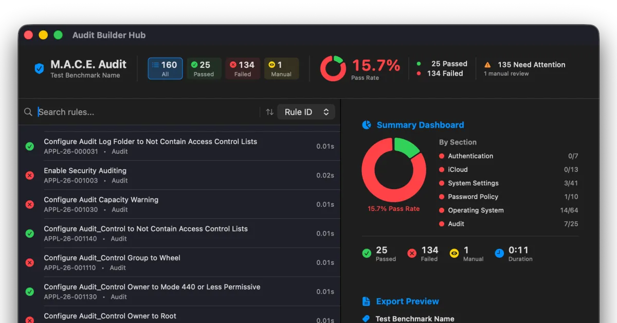 MACE resuelve esto actuando como una interfaz gráfica de usuario para mSCP. En lugar de buscar líneas de código para encontrar reglas que deshabiliten la cámara macOS o apliquen una contraseña de bloqueo de pantalla, MACE le muestra estos controles en un panel. Puede cargar una línea de base estándar, como NIST 800-171 o pruebas comparativas CIS, y luego activar o desactivar reglas específicas según las necesidades de su organización.