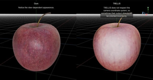 Aquí una comparativa de algunas reconstrucciones entre LiTo y un modelo llamado TRELLIS, como el de Apple pagina del proyecto: