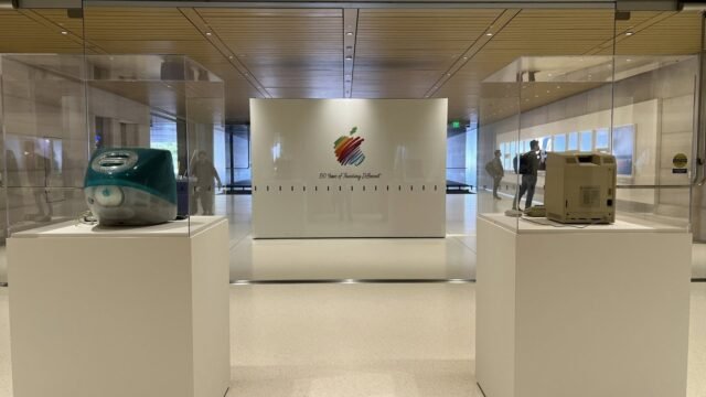 imagen dividido por Maryam Al Sultan en X muestra una gran sala con imágenes y productos en vitrinas. Descrito como una exhibición del 50 aniversario, las tomas aparentemente están en la “Sección 2” del Apple Park, pero hay otras exhibiciones en otras áreas de la sede.