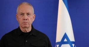 El despedido ministro de Defensa de Israel, Yoav Galant, abandona la...