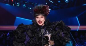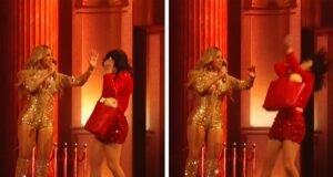 Maria Kerry finge llegar al bailarín durante el premio MTV Video...