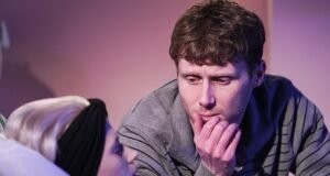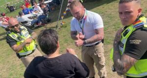 La ex estrella de los Estrenders, Jamie Borethwick, cayendo mientras ella...