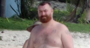 Un Sam Smith sin camisa muestra su torso tatuado mientras se...
