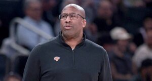 Mike Brown de los Knicks escucha el teléfono de un periodista...