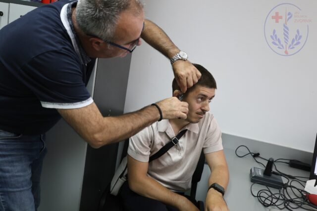 El Dr. Mladen Gurdeljević (derecha) revisa a Selim Mujanović en busca de su audífono.
