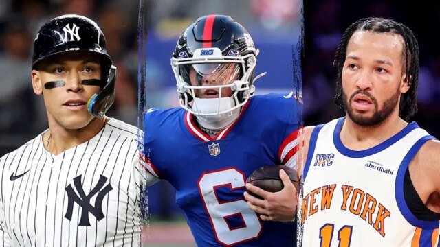 (Izquierda) El jardinero derecho de los Yankees de Nueva York, Aaron Judge (99), reacciona después de poncharse en la octava entrada del cuarto juego de la ALDS de los playoffs de la MLB 2025 en el Yankee Stadium el 8 de octubre de 2025 en el Bronx, Nueva York. Los Francisco 49ers durante la segunda mitad en el estadio MetLife en East Rutherford, Nueva Jersey, el 2 de noviembre de 2025. (R) El guardia de los New York Knicks, Jalen Brunson (11), se muestra en el Madison Square Garden el 11 de noviembre de 2025 en Nueva York. (Brad Penner/Imagon Images; Ed Mulholland/Imagon Images; Wendell Cruz/Imagon Images)
