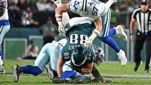 Goedart lideró a los Eagles con siete recepciones en su primera semana de victoria contra Cowbays. En su ausencia, finalizará el respaldo de Grant Calketera y Kyllen Granson para tomar medidas para los pájaros.