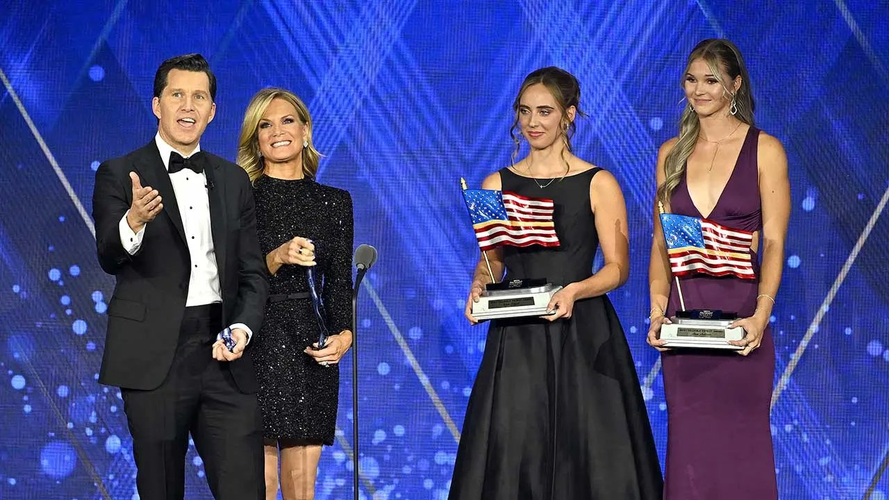 Reese Eckerd y Alexa Anderson aceptan el Premio Patriota Más Valioso de manos de Will Cain y Martha McCallum en el escenario durante los Premios Fox Nation Patriot 2025 en el Tiles Center for the Performing Arts el 6 de noviembre de 2025 en Greenvale, Nueva York. (Roy Rochlin/Getty Images)