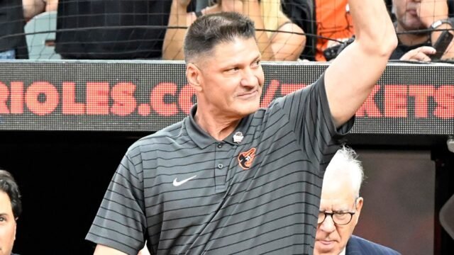 Ben McDonald Cal Ripken Jr. 2131 presentó a la multitud a la multitud durante el 30 aniversario, antes de un juego interlig entre los Dodgers de Los Ángeles y los Orioles de Baltimore en Orol Park el 5 de septiembre de 2025. (Imagen de diamante a través de la imagen Getty)