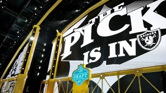 La primera tarjeta de selección general de los Raiders de Las Vegas se muestra durante la primera ronda del Draft de la NFL 2026 el 23 de abril de 2026 en el estadio Akrisar de Pittsburgh, Pensilvania. (Emily Chin/Getty Images)