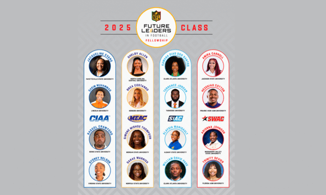 Operaciones de fútbol de la Liga Nacional de Fútbol (NFL), Four Histor Tihassically anunció parte del Black College and University (HBCU) Líderes de fútbol de becarios de fútbol 2025Los becarios 2025 representan la próxima generación de profesionales del fútbol y obtendrán experiencias valiosas apoyando sus respectivos programas universitarios esta temporada.