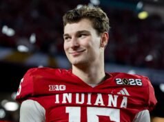 El mariscal de campo de los Indiana Hoosiers, Fernando Mendoza, hace gestos después del partido del campeonato nacional de la CFP contra los Miami Hurricanes el 19 de enero de 2026 en el Hard Rock Stadium en Miami Gardens, Florida. (Kirby Lee/Imágenes de Imagon)