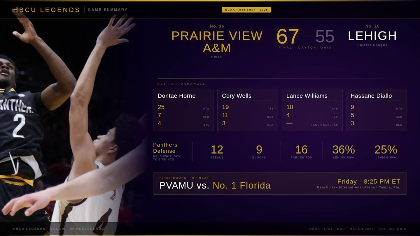 houston – Prairie View A&M hizo historia al derrotar a Lehigh, 67-55, en un juego de los Primeros Cuatro del Torneo de la NCAA en Dayton. La victoria marcó la primera victoria en un torneo de la NCAA del programa de baloncesto Panthers desde que el campo se expandió a 68 equipos.