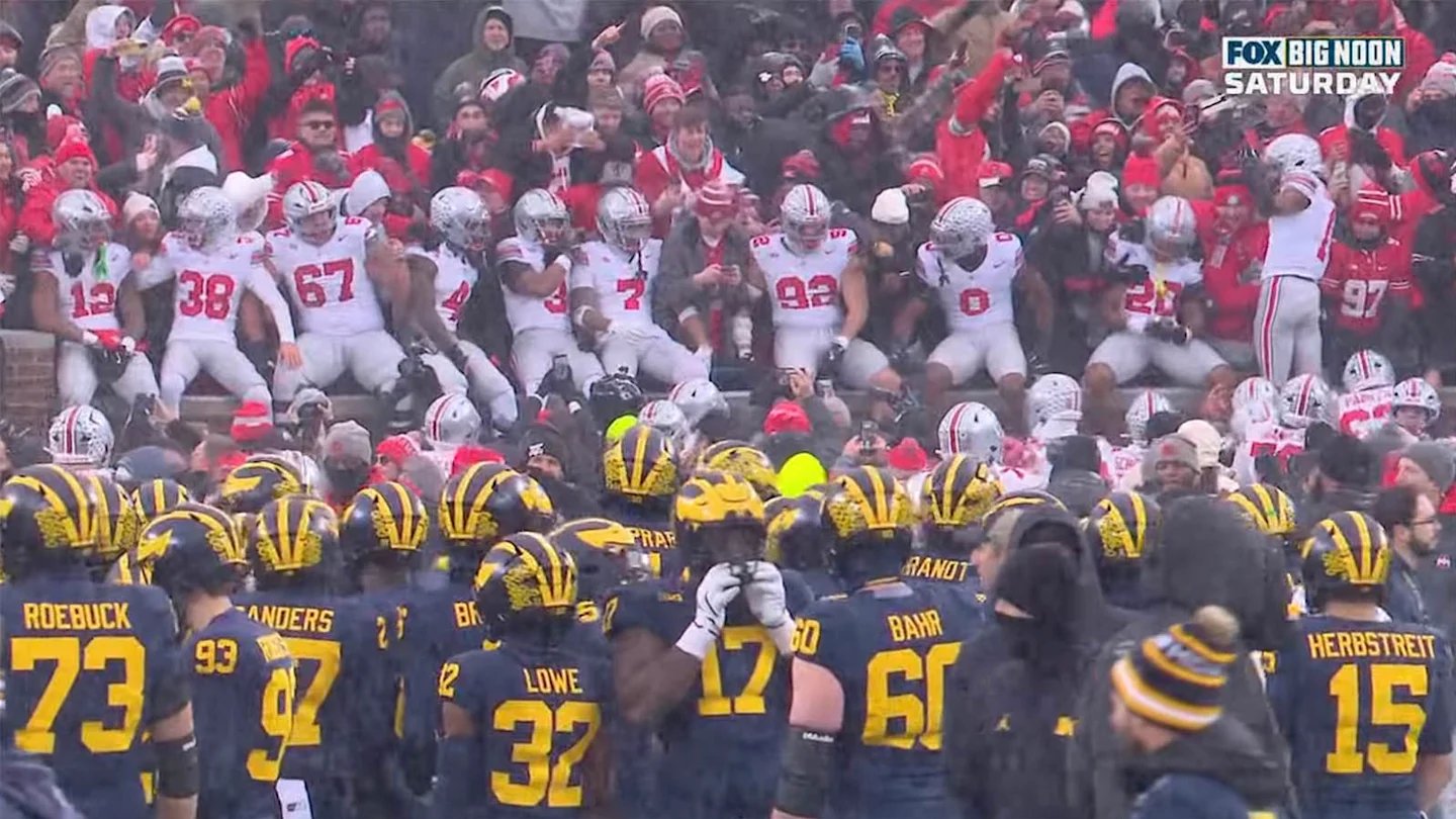 “Gus, Michigan no abandonó el campo”, dijo el analista de Fox Sports, Joel Klatt, al locutor jugada por jugada Gus Johnson en la transmisión. “Ohio State protege la ‘M’ mientras se sientan con sus fanáticos”.