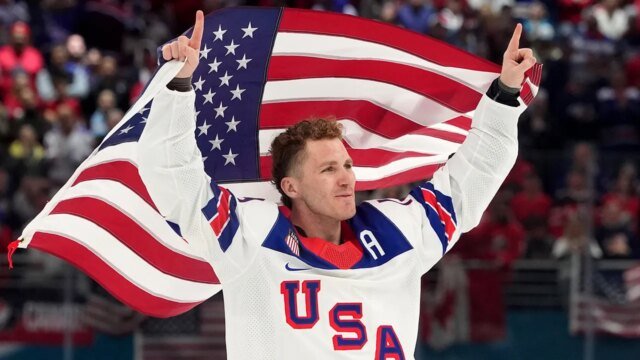 Matthew Tkachuk sostiene la bandera estadounidense