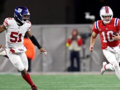 El mariscal de campo novato de los New York Giants, Jaxon Dart, recibió un gran golpe durante una pelea en el primer cuarto contra los New England Patriots.