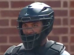 El tiro de Chapman pareció un poco alto, pero fue atrapado por el guante de Schmitt y detrás de él. Eso permitió que un corredor en tercera base anotara mientras los Padres ampliaban su ventaja a 2-0.