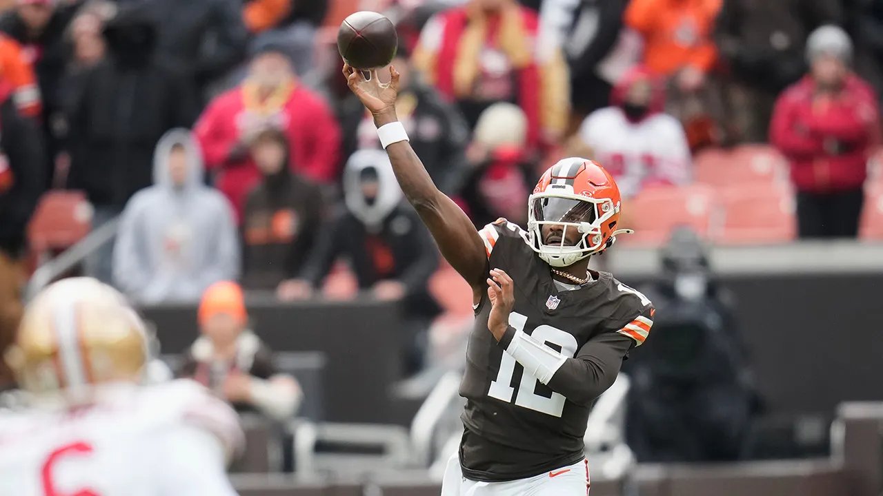 El mariscal de campo de los Browns, Shedur Sanders, contra los 49ers de San Francisco, el domingo 30 de noviembre de 2025, en Cleveland. (Foto AP/Sue Ogrocki)