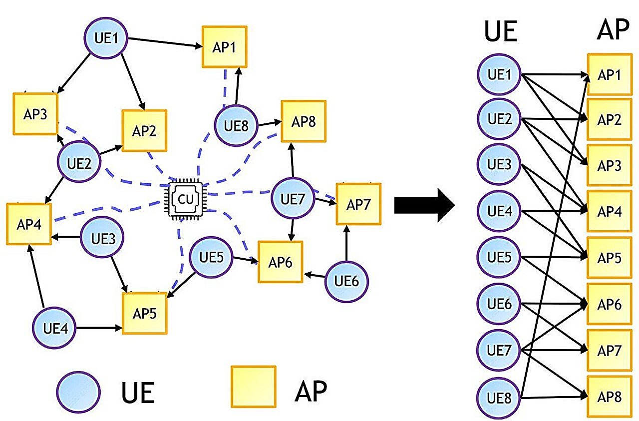 Llustración de una red sin células (izquierda) y su presentación del gráfico factor (derecha). El UE y AP presenta el dispositivo de usuario y la pequeña estación base, respectivamente. Crédito: Universidad Nacional de Taiwán