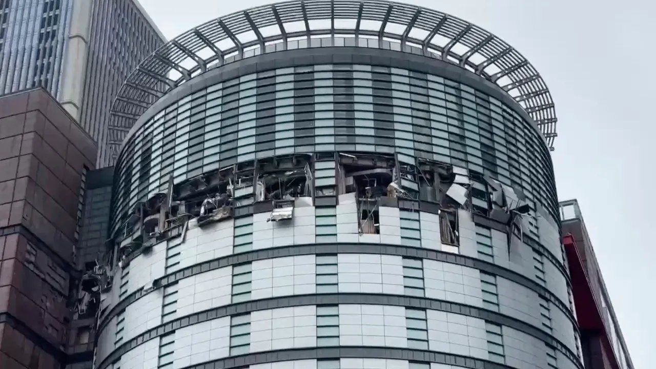 La imagen tomada del video de TVBS en Taiwán mostró que el jueves 13 de febrero de 2025, la ciudad de Taiwán de Taiwán explotó en el frente dañado de la tienda departamental Shin Kong Mitsukoshi. (TVB a través de AP)