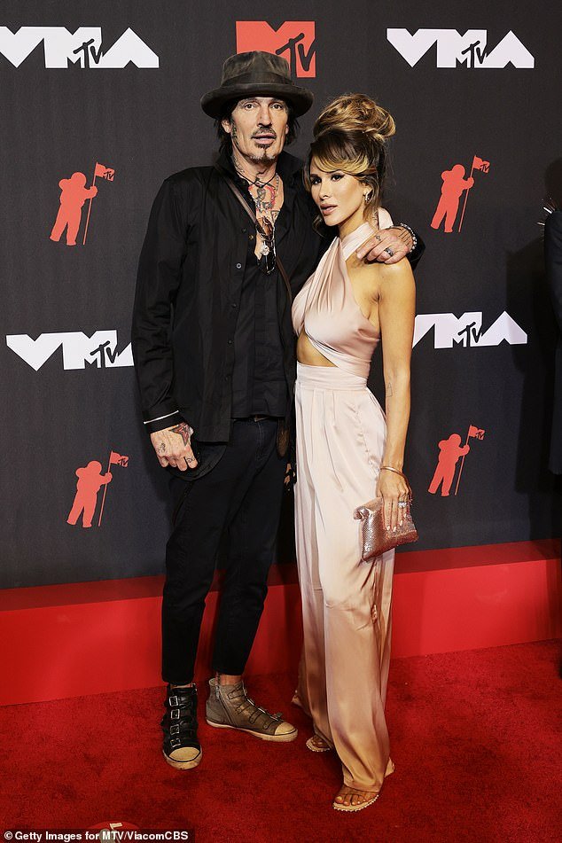 Tommy Lee (2) y su esposa Britannie Farlan (1) están separados por su consumo de alcohol. Representado en el MTV Video Music Award en 2021