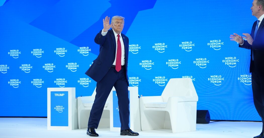 El presidente Trump abordó muchos objetivos familiares y algunos nuevos en un largo discurso pronunciado el miércoles en el Foro Económico Mundial, en el que alternativamente elogió y amenazó a los aliados europeos y reiteró su reclamo de propiedad de Groenlandia.