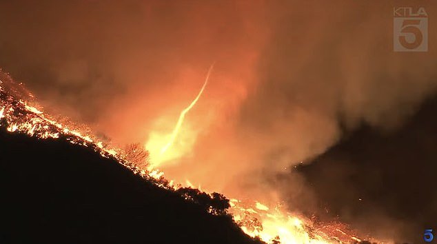 El video muestra el tornado de fuego girando mientras se propaga hacia Mulholland Drive en las montañas de Santa Mónica.