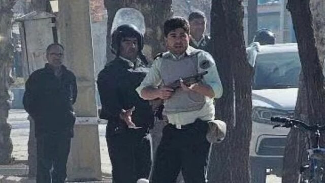 También compartió una imagen que muestra a un oficial de policía iraní con chaleco antibalas y portando una escopeta.
