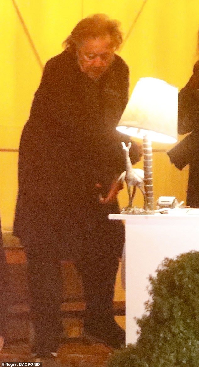 El actor de El Padrino vestía un abrigo negro con una bufanda y pantalones de vestir mientras su antiguo amor lo escoltaba fuera del restaurante.
