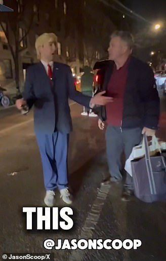 Sin embargo, la disfrazada rutina de comedia de Jason Scoop de Trump estaba frente a la rutina de comedia y el centro recibió un disparo en el rodaje cuando identificó a Baldwin como un ‘asesino’ fuera de su casa de Nueva York, amenazando con romperse el cuello durante la colisión.