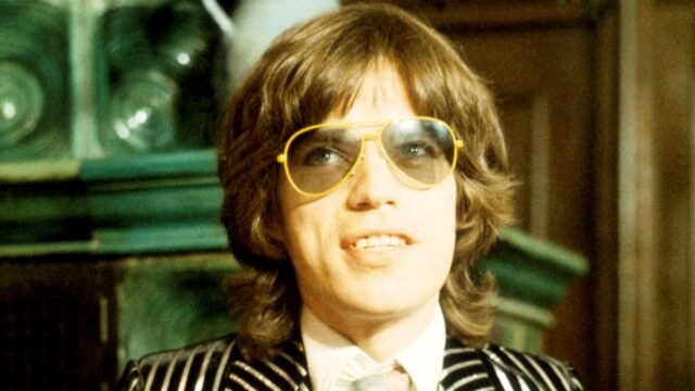 El cantante de los Rolling Stones, Mick Jagar, vistiendo una suite de rayas de Granny toma un viaje en 1973.