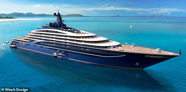 728 pies de largo, fue anunciado como el yate más grande del mundo, un ‘residentes millonarios flotantes’ ofrece acceso a una ‘playa a bordo’ y una botella de 10,000 bellezas de vino.