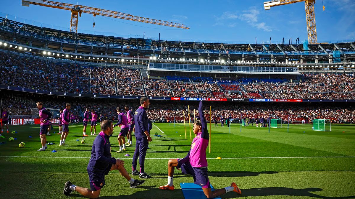 Sin embargo, su icónico estadio, que fue objeto de una remodelación de £1,25 mil millones en ese momento, permaneció cubierto de grúas mientras 23,000 fanáticos asistieron hoy para observar a las estrellas del club en una sesión de entrenamiento abierta.