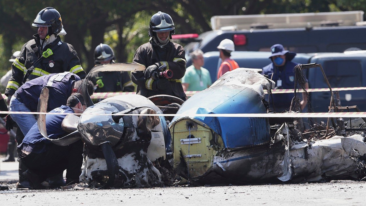 Los bomberos visitaron un pequeño avión se estrelló en una calle en Sao Paulo, Brasil, el viernes febrero. (AP/Ator Cheergui)