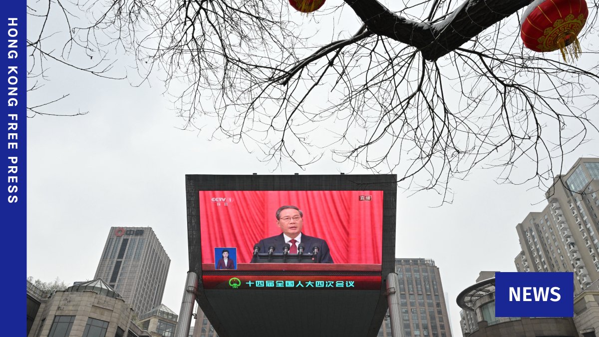 Una pantalla muestra al primer ministro chino, Li Qiang, entregando un informe de trabajo durante la sesión inaugural del Congreso Nacional del Pueblo (APN) en el Gran Salón del Pueblo de Beijing el 5 de marzo de 2026. Foto: Adek Berry/AFP.