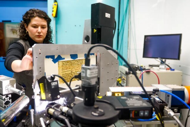 El miércoles por la mañana en el Laboratorio Nacional del Acelerador SLAC en Menlo Park, los investigadores enfocaron una poderosa máquina de rayos X en páginas de pergamino de un monasterio medieval en el desierto para revelar rastros ocultos del mapa estelar más antiguo del mundo.