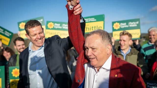 Lindsay Whittle, a la derecha, celebra la victoria en Plaid Cymru: la primera vez que el Partido Laborista no gana una circunscripción del Senado desde su creación en 1999.