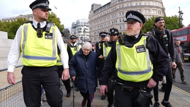 Los oficiales de policía arrestaron a un manifestante en un scooter de movilidad en Trafalgar Square que sostiene un cartel que ‘me opongo al genocidio, apoyo la acción de Palestina’