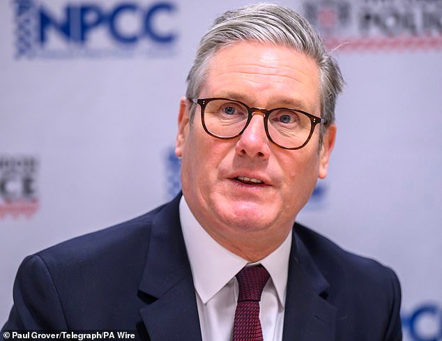 El primer ministro Sir Keir Starmer (en la foto) respondió a las preguntas sobre las bandas de acicalamiento advirtiendo contra la “extensión de la extrema derecha” durante una visita a una comisaría de policía de la ciudad de Londres.