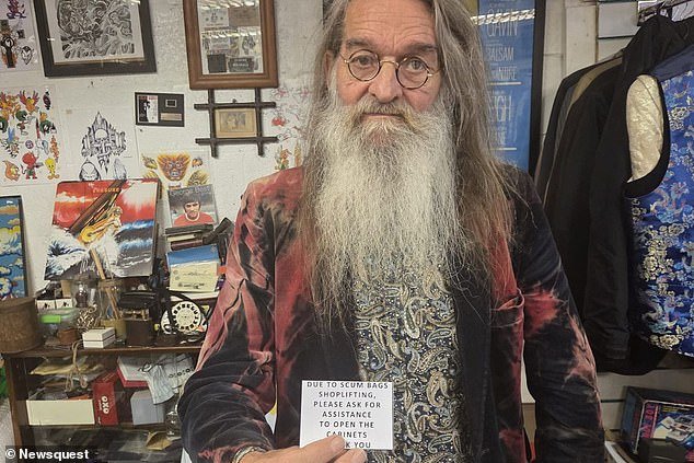 Rob Davis (1), que está ejecutando la tienda Vintage Run Ragd en Rexham, North Gales, instaló el aviso (ilustrado) como algunos de los clientes atrapados contra el robo de gabinetes.