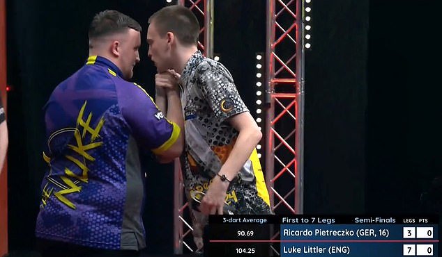 A pesar de la nariz de su nariz con su oponente, Littler sacó una expresión sorprendida hacia la multitud antes de señalar a Pitreczco con el pulgar.