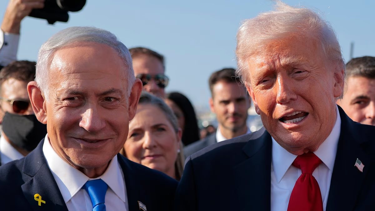 Donald Trump habló con el primer ministro de Israel, Benjasin Netanyahu, en el aeropuerto internacional Ben Gurion antes de abordar su avión el lunes.