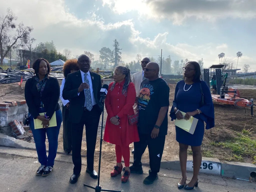 Rita y Terry Pyburn con su abogado Ben Crump, jueves 5 de marzo de 2026, frente a la casa de Pyburn que quedó destruida en el incendio de Eaton. (Edison del sur de California)