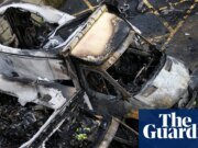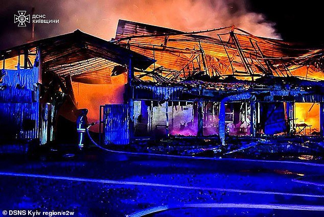 El metraje mostró un fuego ardiente en un almacén en Sumi después de la huelga rusa.
