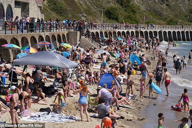 La gente disfruta del clima cálido en Sunny Sands Beach en la piedra folkstone de Cant el 12 de julio
