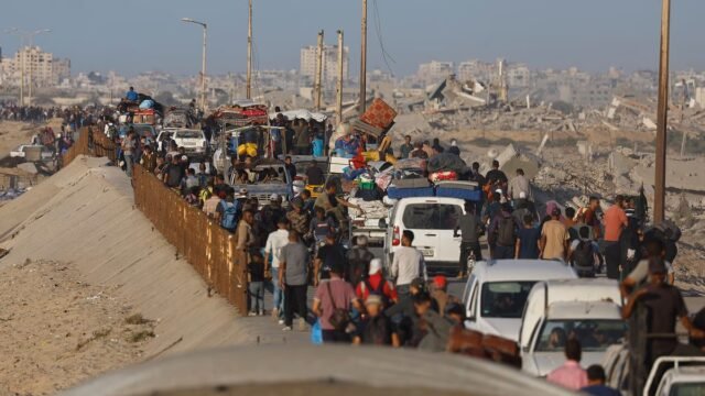 Los palestinos desplazados caminan por la carretera costera hacia la ciudad de Gaza