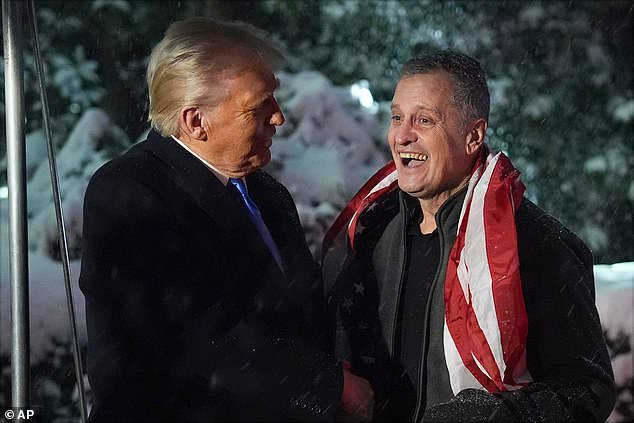 “Estoy muy emocionado”, llegó Fogel Trump a una Casa Blanca llena de nieve que una bandera estadounidense de banderas estadounidenses regresó a los Estados Unidos después de que se extendió a su cuello.