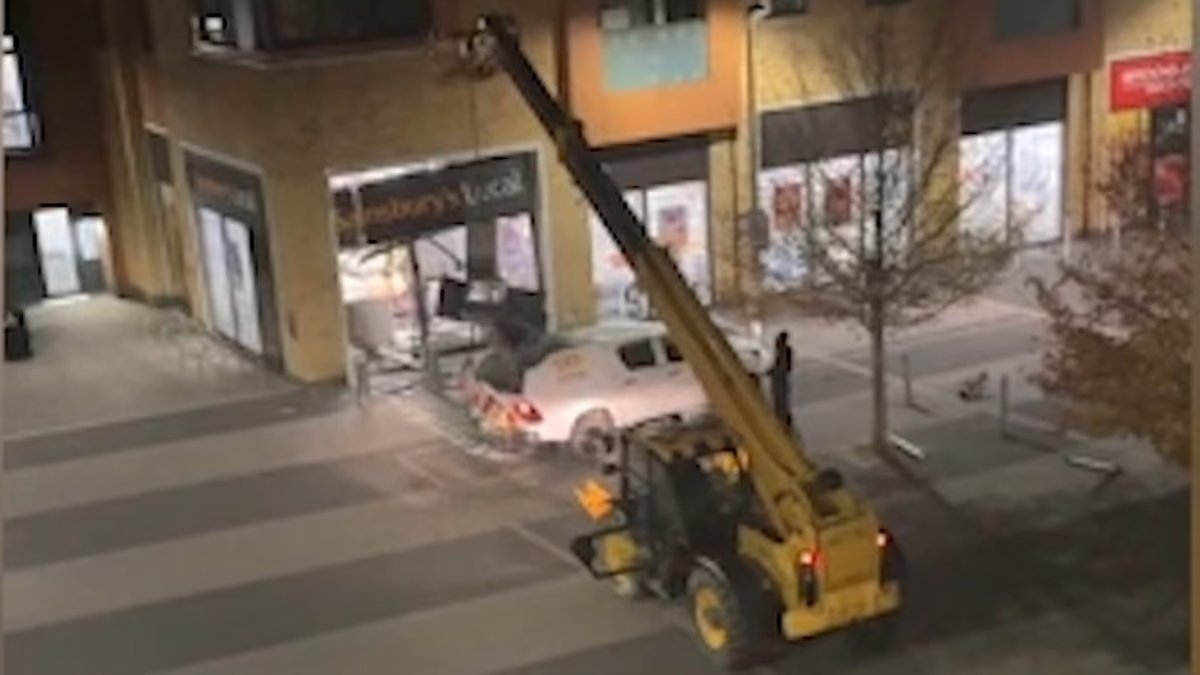 En las imágenes tomadas por residentes del vecindario horrorizados, se puede ver maquinaria pesada sacando el cajero automático de un agujero en la pared y causando daños importantes al frente de la tienda en Milton Keynes.