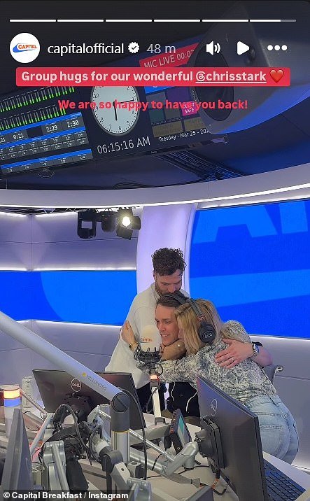 El anfitrión de Capital Greate, Chris Stark (1), fue apoyado por sus co-actores porque hizo un regreso emocional a Airwave en su guerra secreta del cáncer el martes