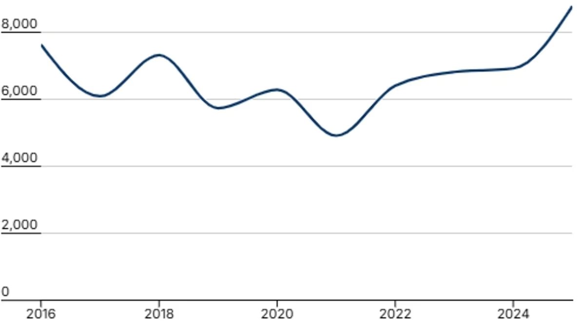 El total para 2024/25 es un 27 por ciento más alto que las 6.922 referencias del año anterior, lo que lo lleva al número más alto desde que comenzaron los datos en 2015.
